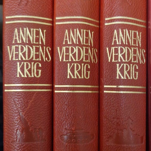 Otto Ruge Annen Verdenskrig bokserie i tre bind med rød hardcover. Bøkene inneholder tekst og bilder om andre verdenskrig, utgitt av Halvorsen & Larsen Forlag i Oslo i 1947.