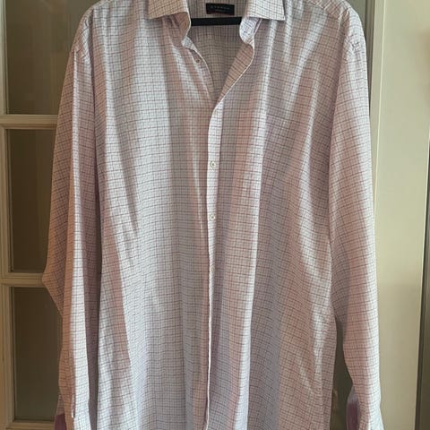 Merke: Dressmann. Pent blomstrete mønster på innsiden av kraven. Brystvidde: 132 cm, Arm lengde: 69 cm, Hel lengde: 84 cm, Halsåpning: 43 cm. Ikke røyker. Kan sendes som FIKS FERDIG, eller hentes etter avtale. Tar kontant betaling eller vips. Kjøper betaler for frakt.