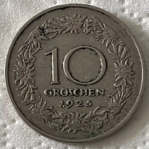 Østerrike 10 Groschen mynt fra 1993. Mynten har en diameter på omtrent 19 mm og er laget av metall. På forsiden er det et ørn-emblem med teksten "REPUBLIK ÖSTERREICH". På baksiden står verdien "10 GROSCHEN" og årstallet 1993. Mynten er en del av Østerrikes tidligere valuta før innføringen av euro.