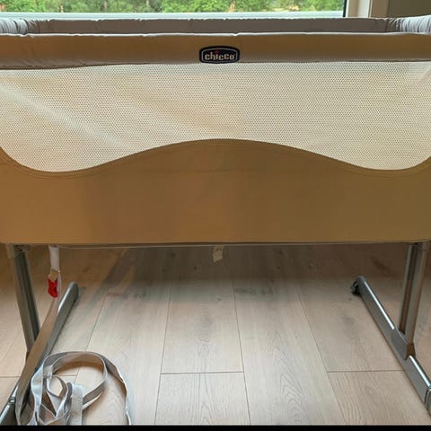 Fin og praktisk bedside crib. Kan justeres i høyden og på en side som er praktisk for å kunne heve hode.