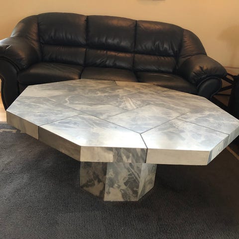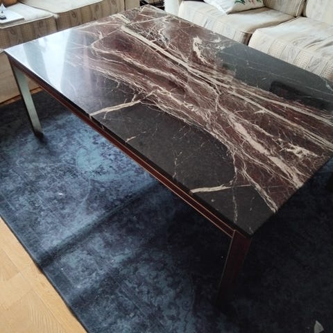 Nydelig bord med spiler i tre og polert bordplate i Silestone Dessert Silver. Platen tåler mye mer enn marmor! Må hentes.