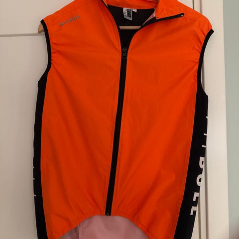 Vesten er laget av lett og pustende materiale, designet for å gi beskyttelse mot vind under sykling. Den har glidelås foran og en baklomme med glidelås for oppbevaring, samt innerlomme for mobil.