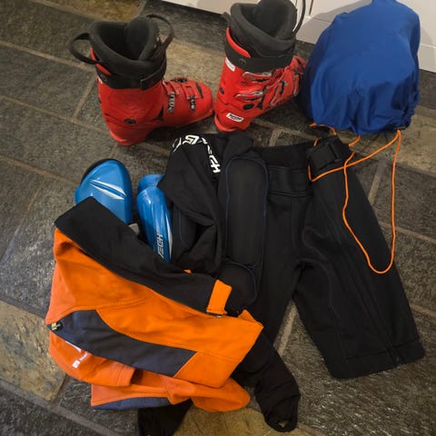 Alpin racing utstyr U10-14. Staver, hansker, varmejakke, hjelmer, shorts