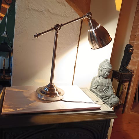 Koselig bordlampe med tre motiv. Flott til mørke høst kvelder for stemning. Gullfarget skjerm med sølvfarget lampefot. Skjermen er laget i plast lignende materiale. Foten i metall. Kan sendes.