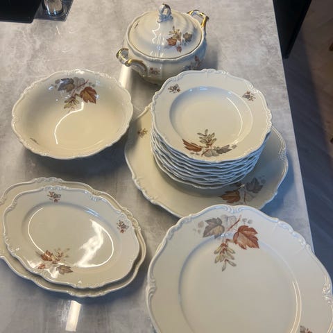 Alt er i pent brukt stand – kun én tallerken har et lite hakk. Ellers veldig pent og lite brukt.