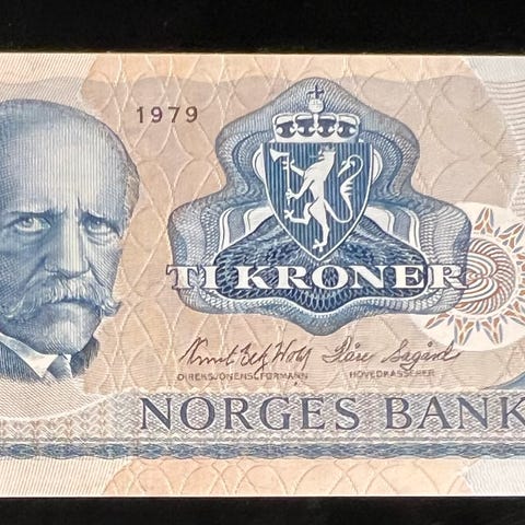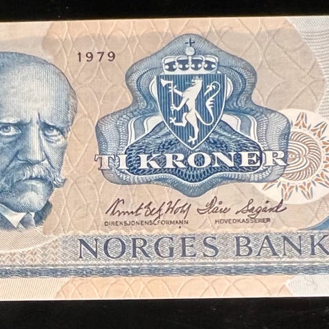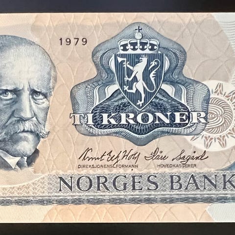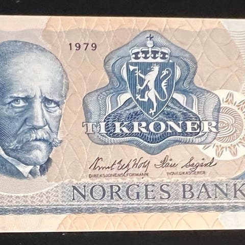 Den norske 10-kroners seddelen fra 1979 i bildet er en såkalt "erstatningsseddel".