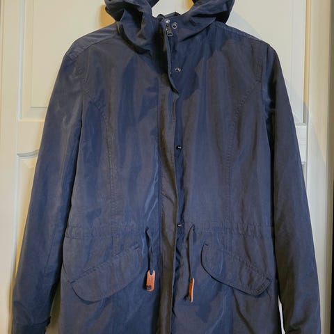Pent brukt vindjakke med snøring i nedkant og rundt hetten. Fargen er petrol, litt mørkere og grønnere en den fremstår på bildet.