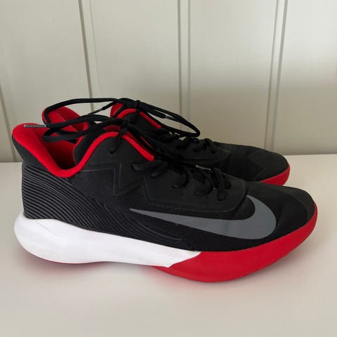 Skoene har svart overdel med røde og hvite detaljer. Materialet ser ut til å være en kombinasjon av tekstil og syntetisk materiale. Designet er mid-cut, som gir støtte rundt ankelen. Sålene har mønster for grep, og skoene er beregnet for basketballbruk.