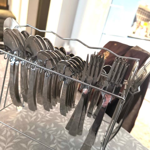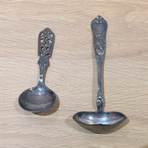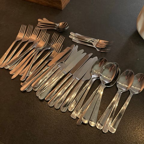 Kjøpte for 2 år siden, men tok ikke i bruk da jeg fikk et annet bestikksett jeg likte bedre. Har ligget i en eske siden det. Bestikket er relativt stort (innenfor normalen).