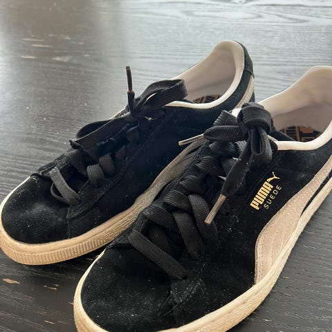 Selger et par hvite Puma skinnsneakers i størrelse 39. Dette er tidløse sko som passer til det meste – enten du skal bruke dem til hverdags, på jobb eller fritid. De har vært brukt en del, men er fortsatt hele og i god stand. Skinnet gjør dem slitesterke og komfortable.