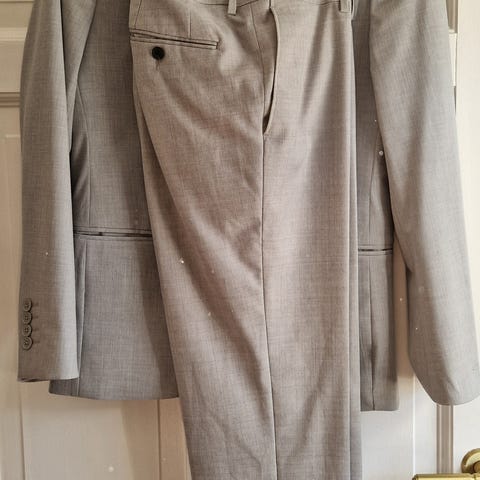 Dressmann dressjakke og bukser i grå farge, herremodell i størrelse 48. Dressjakken har klassisk snitt med knappelukking og lommer. Buksene er tilpasset samme farge og materiale som jakken, designet for formell bruk.