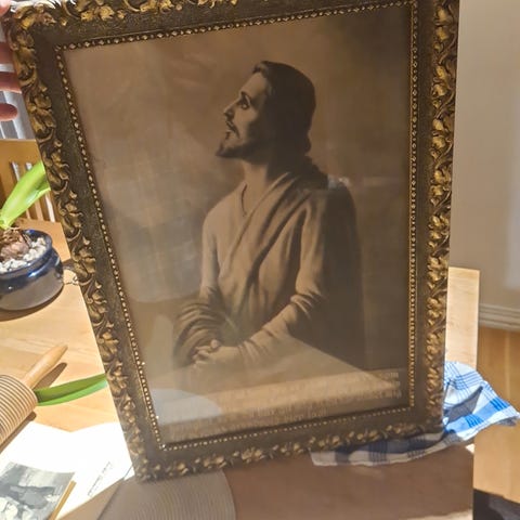O. M. Knudsen bilde som viser Jesus med sauer. Bilde er innrammet med en dekorativ ramme. Passer til dekorasjon i hjem eller andre steder som ønsker religiøst motiv. Bildet har hvert i familien i ca 50år .22cm bredt og 28cm høyt.