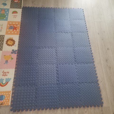 Ukjent merke skumgulv puslespillmatter i blå og grå farger. Mattene er laget av mykt skummateriale og kan kobles sammen for å dekke ønsket gulvareal. Egnet for bruk som underlag for lek eller trening.
