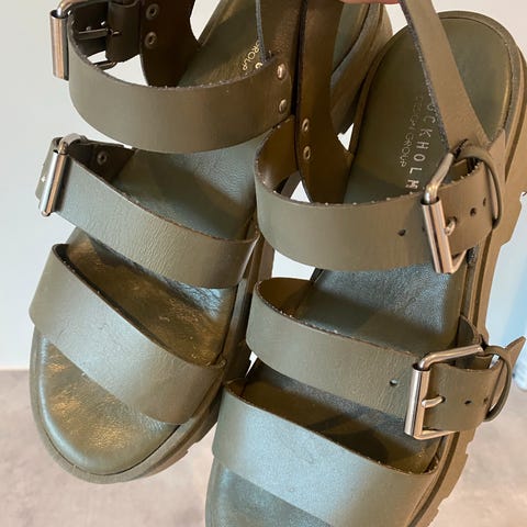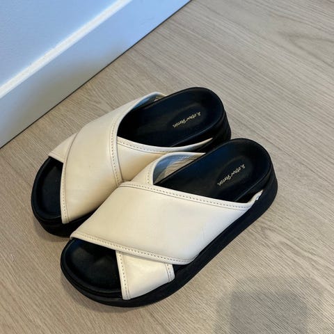 Stockholm Design Group slippers i størrelse 39. Slippersene har en beige farge og er utformet med en åpen tå. De har en tykk såle med mønster for grep.