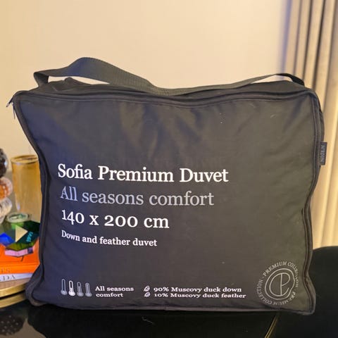 Selger en deilig dundyne med tungt hjerte, som rakk å være i bruk kun i en måneds tid. Selges pga. allergi. Oppbevaringsposen følger med.