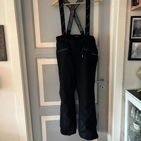 Hafjell Extreme. Litt slitt nederst på buksebena (se bilde). Buksen er vanntett, vindtett og ventilerende. Den har borrelåsstramming i livet, gamasjer med gummiering rundt fot, og lufting på innsiden av lår. Det er i tillegg lagt inn ekstra forsterkningerer på innsiden av fot, der slitasjen er størst.