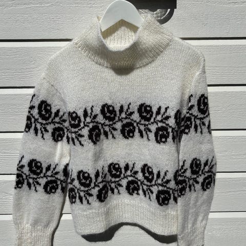 Selger genseren strikket av meg, str xs, men passer også en S. Brukt én gang, ble litt stor til meg. Strikket i Peer Gynt og Tynn Silk Mohair farge marsipan. Nydelig og varm genser! Genseren har italiensk avfelling alle steder. Lengde eksl. hals; 62 cm, ermer 49 cm.