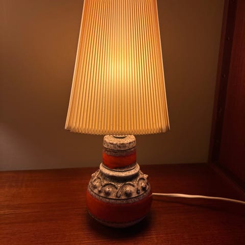 retro keramikk lampe, stor bordlampe, signert keramikk, vintage interiør, lampefot i keramikk, studio pottery, rød lampeskjerm, 70-talls stil, E27 lampe, norsk design