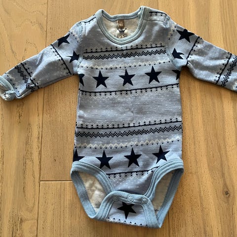 Hust & Claire body i størrelse 68. Bodyen er lysblå med mønster av mørkeblå stjerner. Den har lange ermer og knappestolpe i skrittet for enkel av- og påkledning.