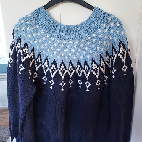 Ny hjemmestrikket Miranda genser strikket I deilig mykt Air garn dtr iverv 112cm, hl 56cm og arm 46cm.