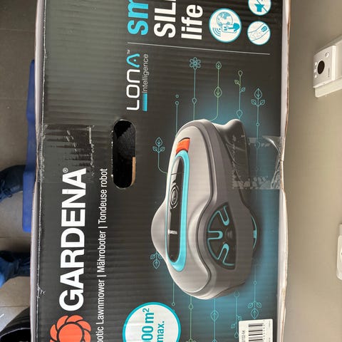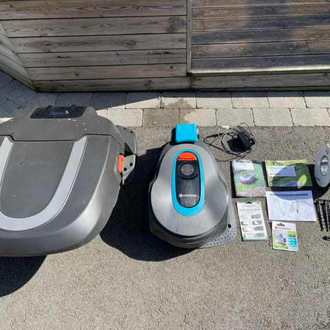 Selges fordi den fikk problemer med GPS dekningen pga smal passasje mellom høye hus. Selges rengjort og med nye kniver. Følger med ladestasjon og smart hub for å koble den opp mot wifi.