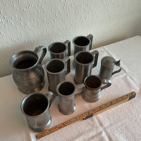 Lysestaker, skåler, bokser, kopp, fat i tinn selges samlet.