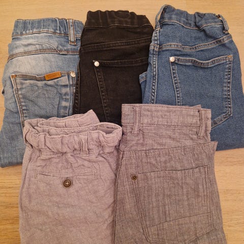 Shortspakke med 6shortser i forskjellige stoffer og til forskjellige formål. En turshorts, fire jeans, og en i finere tøy.