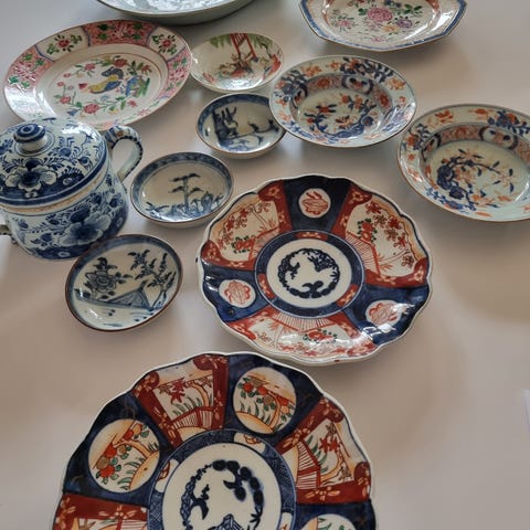 Det er gått et skår av terrinen det meste av skåret følger med og kan limes på. Det er også en hårsprekk se siste bildet og noe krakkelering