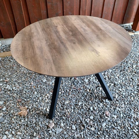 Et unikt spisebord i røff utførelse, stor rund 40 mm plate i furu. Beiset svart og oljet med matsikker benkeplate olje. Beina er i massivt tre fra gammelt låve reisverk, beiset med Herdins mahogni beis og oljet med kinesisk treolje. Fester til bein og kryss i midten er i sveiset stål og lakkert svart silkematt.