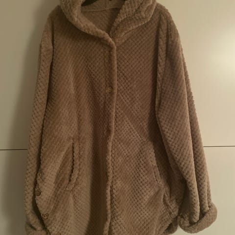 Ny jakke med hette og knepping str XL , lappen ble dessverre tatt av. Supermyk og lett i en varm brunfarge.