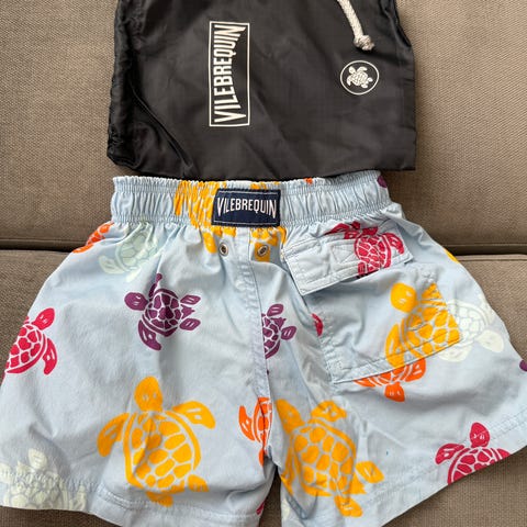 Shorts fra Vilebrequin med trykk av skilpadder. Det er str.92, men vi har brukt den ved str.86, siden man kan stramme den inn i midjen med strikk.