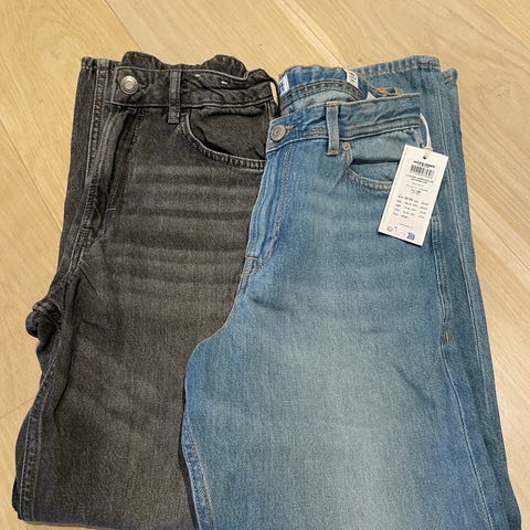 Loose fit jeans fra HM i svart farge i str. 158 selges. En vid/wide type denimbukse. Lite og pent brukt da den ble for liten etter kort tid. Ingen hull, flekker eller annen nevneverdig slitasje.