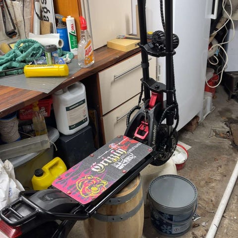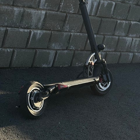 Elektrisk sparkesykkel i svart og rød farge. Modellen har kraftig frontdemper og doble frontlykter montert på styrestolpen. Plattformen er bred og rektangulær, egnet for stående bruk. Styret har kabelføring langs stolpen. Egnet til persontransport på asfalt og andre jevne underlag. Nærmere tekniske spesifikasjoner som rekkevidde, motoreffekt, batterikapasitet og maksimal hastighet er ikke oppgitt.