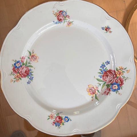 Blomst tallerken laget av keramisk materiale. Tallerkenen er hvit med dekorative blå og røde blomster rundt kanten. Passer til servering av mat.