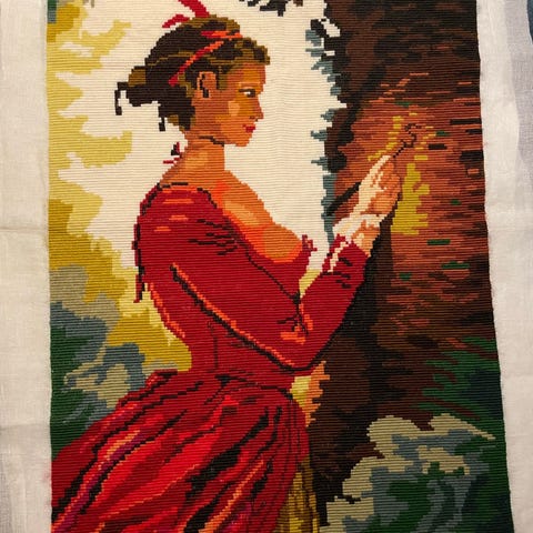 Søkeord: broderi, brodert, klokkestreng, veggteppe, åklebeslag, åkle, klostersøm, teppe, redesign, retro, rustikk, vevet, veveri, gobelin, tekstil, klede, smijernsbeslag til åkle, festdrakt, bunad, tradisjonell.