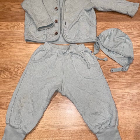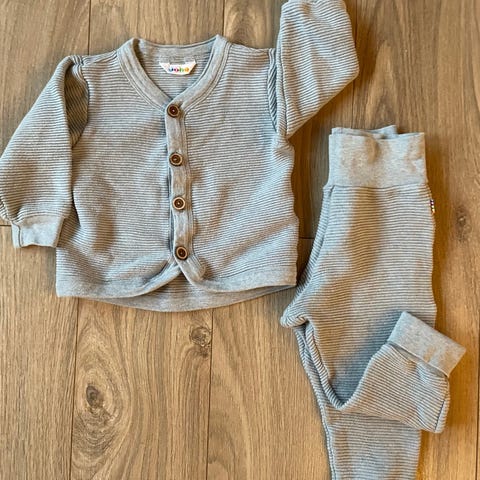 Nydelig Joha sett i organisk bomull selges (100%bomull). Størrelse 90 som tilsvarer 86/92. Jakke med treknapper og lommer, bukse med snør i livet og lommer.