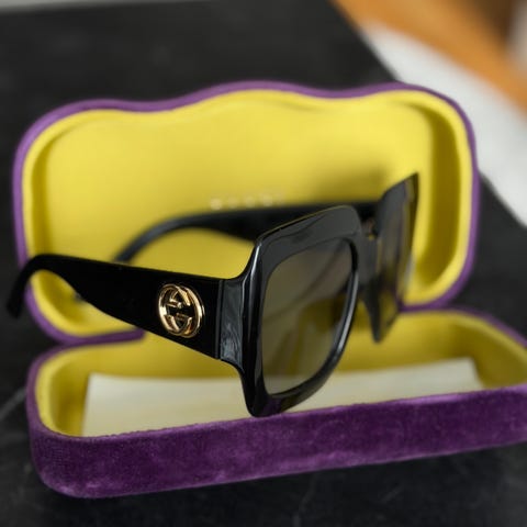 GG 0053S 001 med svart ramme og store firkantede glass. Solbrillene leveres med et originalt etui i lilla og gult, samt en matchende rengjøringsklut. Designet for damebruk. Pris på ny 2949kr.