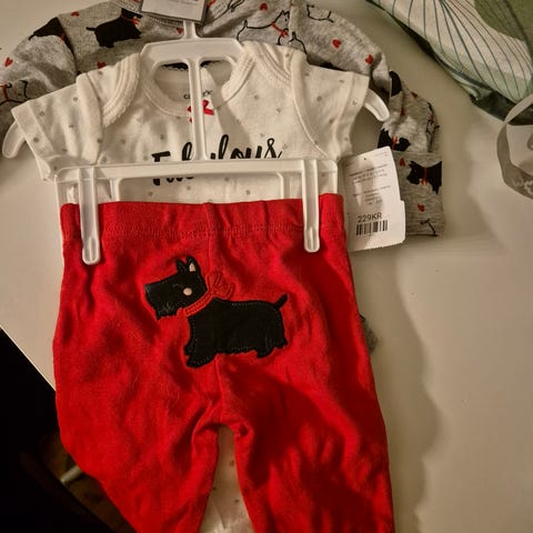 Kun vasket. Fikk aldri brukt klærne pga størrelse.
