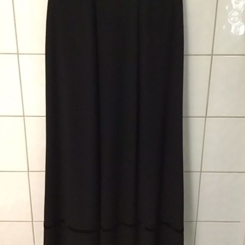 Svart foret skjørt med beige blomstermotiv. Livvidde 78, lengde 85 cm. Diameter nederst på skjørtet er 120 cm. Det er 12 cm lange nedsydde legg frå linningen slik at det er kroppsnært rundt hoftene. Skjørtet har skjulte lommer i sidene, beltehemper og splitt på 30 cm foran, bak og på sidene. Skjørtet er pent brukt.