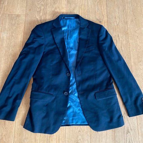 Dressmann Dressjakke i blå farge, størrelse 48 for menn. Jakken har klassisk design med to knapper og er foret på innsiden. Passer til formelle anledninger eller kontorbruk.
