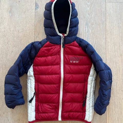 Fineste dunjakken i rødt, hvitt og blått. Pent brukt, mye bruk igjen. Ny pris 600kr