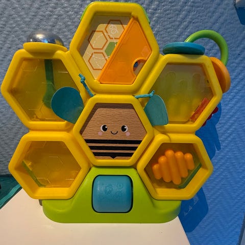 Pent brukte babyleker fra blant annet Fischer price og Baby Einstein selges samlet. Putteboksen mangler en kloss, ellers følger alt med.