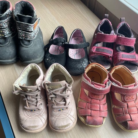 Skopakke med 8 par forskjellige skotøy. Noen helt nye med lapp og resten er brukt en sesong av et barn.
