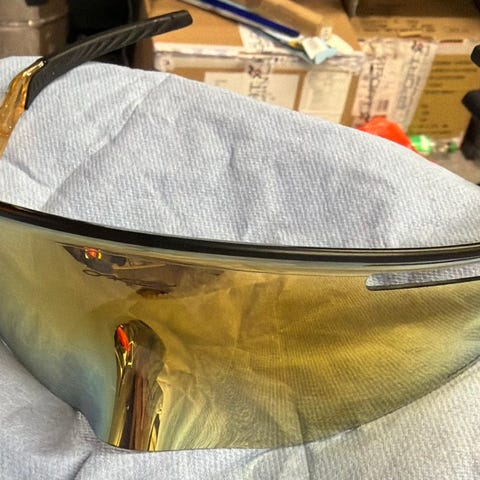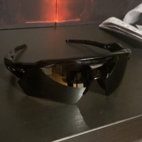 Jeg kjøpte disse nye, og har hatt de oppbevart i et Oakley-skap med resten av mine biller. Har brukt de en håndfull ganger, og selve glasset fremstår som strøkent. I løpet av årenes løp, ser jeg at det er noe krakelering i speilet ved neseroten. Derfor selges disse billig.