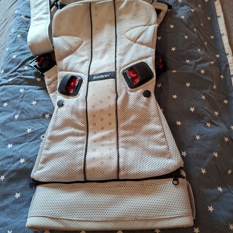 Svart bæresele men justerbare skulderstropper. Kan brukes både på magen og på ryggen.