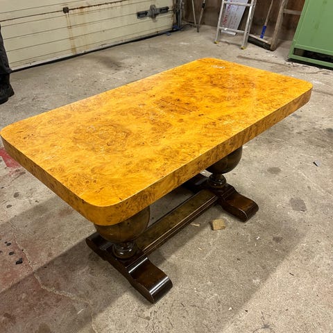 Vakkert salongbord i nyrokokko-stil, sannsynligvis produsert på midten av 1900-tallet. Bordet er laget i heltre med mørk beis og har utsøkte utskjæringer både på sargen og på bena. De svungne cabriole-bena og de detaljerte ornamentene gir bordet et klassisk og tidløst uttrykk.