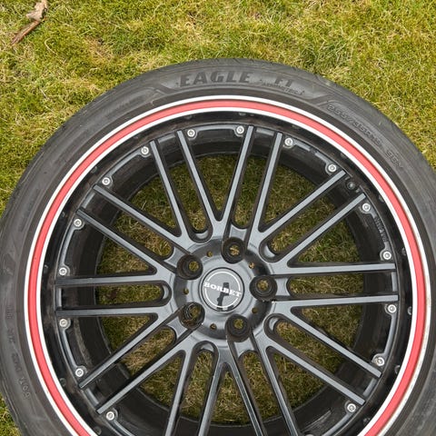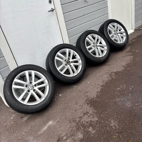 Fete felger og dekk. Har stått på Vw golf 2012. Nankang dekk bak (nye mai 2025)og Maxxis foran. Det er er bruksmerker på de. Kantkjøring osv. Høyre bak er det litt kast i.