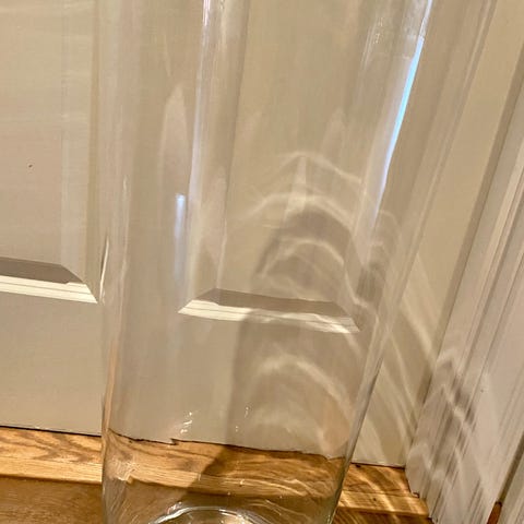 Stor gulvstående glassvase og en stor bukett med dyprosa silkeroser.