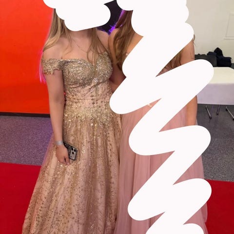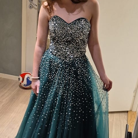 Alexandra Ritzi Festkjole i størrelse S, rosa farge. Kjolen har detaljer med paljetter og et mønster som gir et dekorativt uttrykk. Egnet for formelle anledninger og festbruk. Brukt 1 gang. Ny pris 3600,-