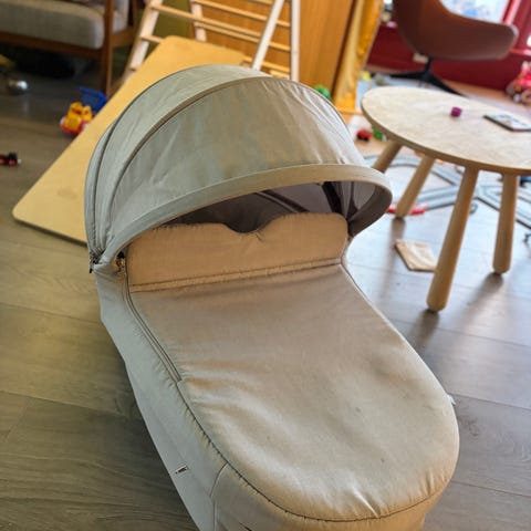 Ubetydelig brukt brukt carrycot/liggedel/bagdel til Stokke Xplory fra 2018. Lys gråmelert farge. Kalesje som kan utvides og med god ventilasjon. Kalesjen kan også brukes på sittedelen. Følger ikke med bøyle, dette kan kjøpes på nett hvis man ønsker dette.